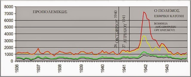 Με κόκκινο συμβολίζονται οι θάνατοι από φυματίωση, με κίτρινο από καρδιακά νοσήματα, με πράσινο και μαύρο από άλλες αιτίες. Όπως βλέπουμε, η φυματίωση έκανε θραύση τον δύσκολο χειμώνα του '41-'42.